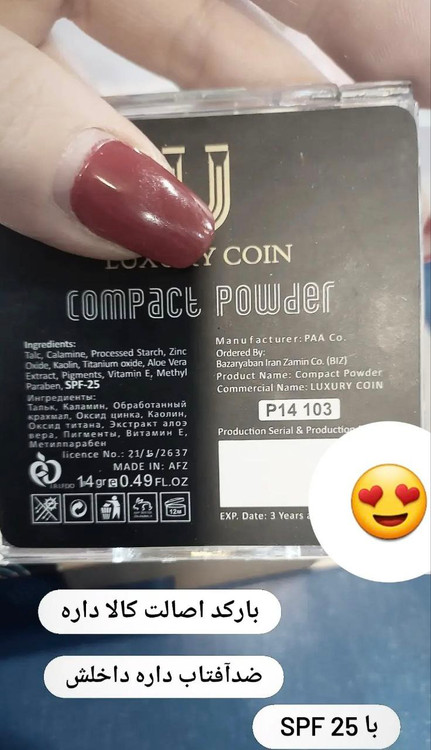 نام کامل محصول پنکک لاکچری کوین شماره 101 رنگ شماره 101 ابعاد استاندارد و قابل حمل وزن 500 گرم پروانه بهداشت دارد (قابل استعلام) کشور سازنده ساخت ایران (تحت لیسانس فرانسه) برند لاکچری کوین (Luxury Coin) فرمولاسیون حاوی عصاره آلوئه ورا، ویتامین E، کلاژن، پودر میکرونیزه و SPF 25 ابعاد 8 × 2 × 8 سانتیمتر مناسب برای انواع پوست (چرب، خشک، مختلط و حساس) مزایا پوششدهی بالا، ماتکننده، ضد آب، SPF 25، ماندگاری طولانی، بافت سبک، بدون ایجاد خشکی و ماسیدگی، جوانکننده، کمک به سفت شدن پوست تاریخ انقضا 3 سال پس از تولید شرایط نگهداری در جای خشک و خنک، دور از نور مستقیم خورشید معرفی جامع پنکک لاکچری کوین شماره 101